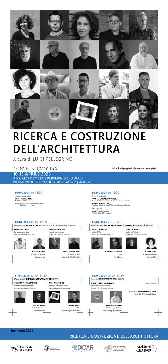 Nei giorni 10, 11 e 12 Aprile 2025, presso la Struttura Didattica Speciale di Architettura e Patrimonio Culturale di Siracusa (Unict), si terrà la prima edizione del convegno-mostra “Ricerca e Costruzione dell’Architettura”. Quattordici docenti-architetti, provenienti da dieci università italiane, si confronteranno sul tema delle relazioni tra ricerca, insegnamento e costruzione dell’architettura.